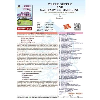 The entire subject of Water Supply and Sanitary Engineering including Environmental Engineering also known as Public Health Engineering is divided in to three parts: (1) Water Supply Engineering (2) Sanitary Engineering (3) Environmental Engineering. The first part deals with the fundamentals of Water Supply Engineering. It discusses the whole science of water supply engineering relating to the quantity and quality of water, sources of water supply, pumps for water supply projects, treatment of water, coagulation of water, filtration of water, disinfection of water, water softening, collection and conveyance of water, distribution system of water, pipe appurtenances, water pollution control, water management, radioactivity and water supplies, etc. The second part of the book deals with the fundamentals of Sanitary Engineering. It discusses the topics such as collection and conveyance of refuse, waste water, quantity and quality of sewage, construction and design of sewers, sewer appurtenances, sewage pumps, house drainage, natural methods of sewage disposal, primary treatment of sewage, filtration of sewage (secondary treatment), activated sludge process, sludge treatment and disposal, miscellaneous methods of sewage treatment, miscellaneous topics of sanitary engineering, etc. The third part deals with the fundamentals of Environmental Engineering. It discusses the topics such as environment, ecology and ecosystem, air pollution, noise pollution, natural resources and population, miscellaneous topics of environmental engineering and environmental legislation. The Appendix A demonstrates the Typical Design of a Sewage Treatment Plant and Appendix B describes some of the Terminology of the subject. The book in its 40 chapters and two appendices includes: * 278 Self explanatory and neat diagrams * 152 Illustrative problems * 68 Useful tables * 690 Questions at the end of chapters.